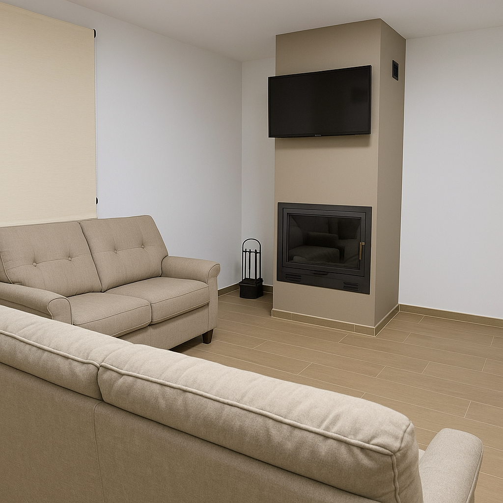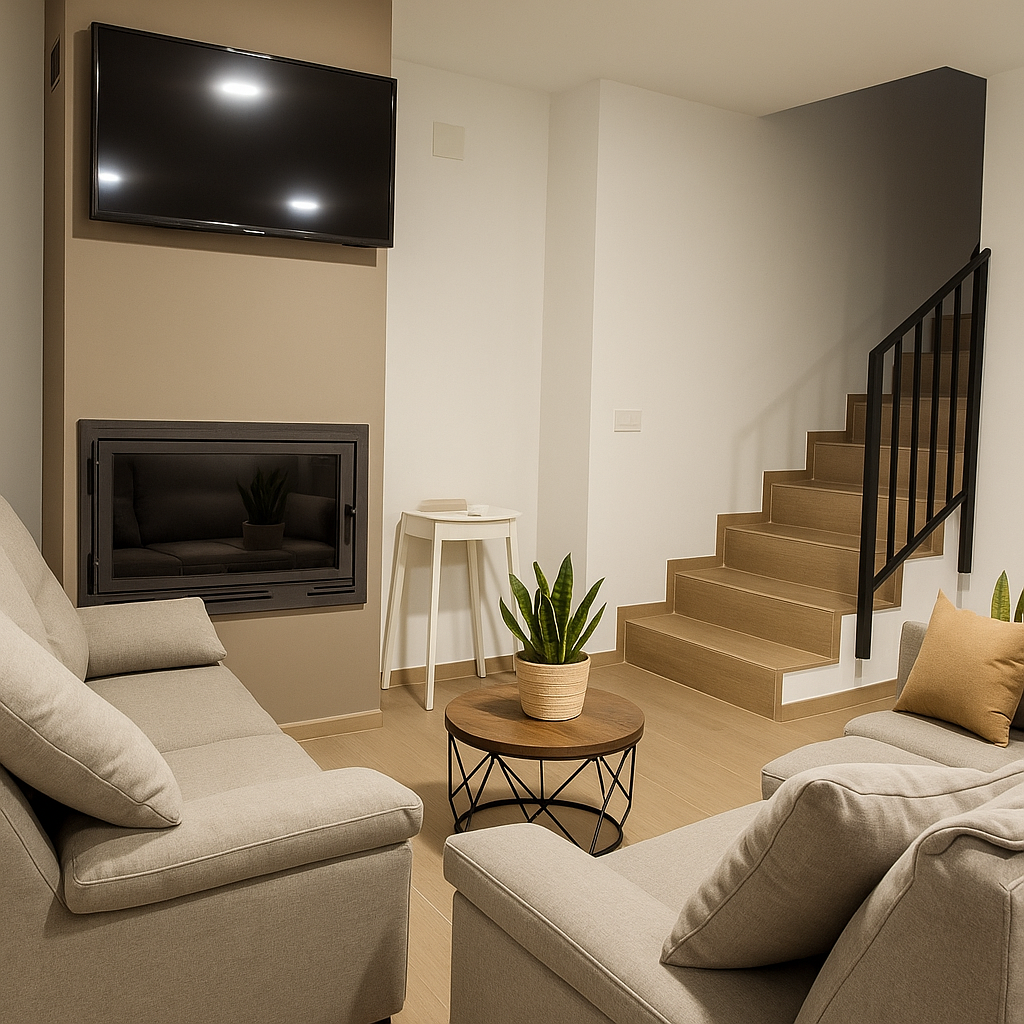 Disfruta de un espacio pensado para relajarte: un salón acogedor, con chimenea integrada, sofás amplios y una atmósfera cálida que invita a alargar cada conversación. La combinación de colores cálidos, luz suave y diseño funcional lo convierte en el rincón ideal para tardes de peli, juegos en familia o simplemente dejar pasar el tiempo con una taza caliente entre las manos.