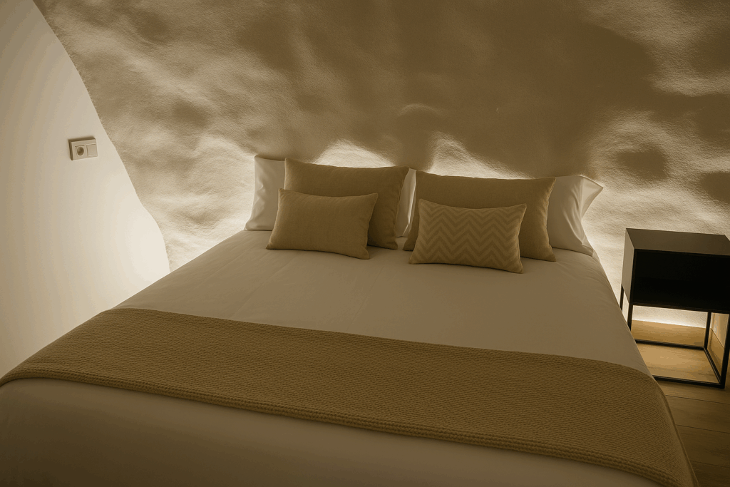 Descansar en esta casa rural es abrazar la calma en su forma más pura. Camas con textiles suaves, iluminación cálida y una atmósfera envolvente que invita al silencio. Cada elemento está pensado para desconectar del mundo y reconectar contigo. Aquí, el descanso no es una pausa: es un regalo.