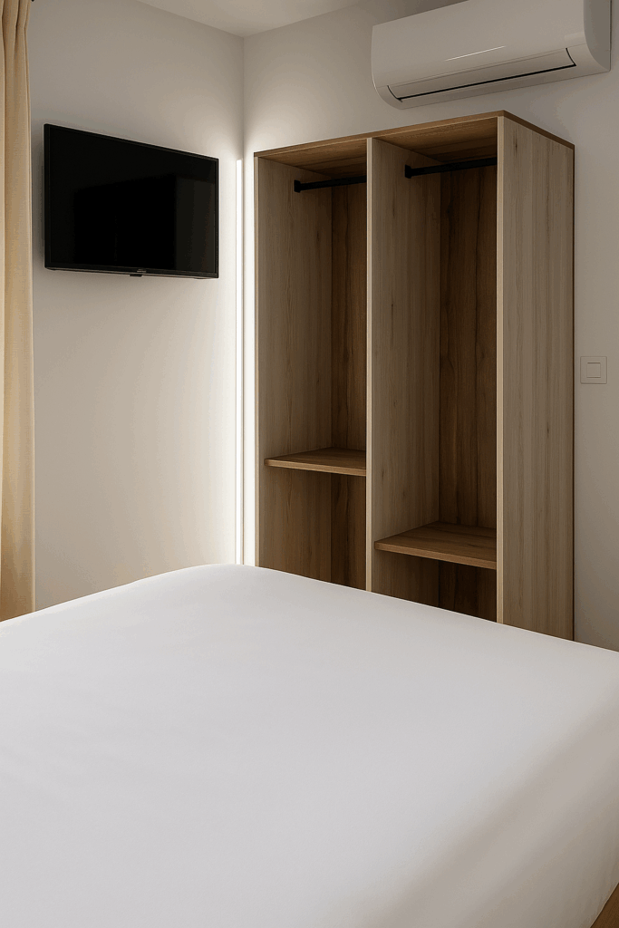 En la planta superior se reparten tres habitaciones: dos con cama de matrimonio y una con dos camas individuales. Todas cuentan con aire acondicionado individual, y las de matrimonio también tienen televisión. Una de ellas está integrada en la roca, ofreciendo una experiencia única de descanso abrazado por la montaña. Además, hay un segundo baño completo enclavado en la piedra natural.