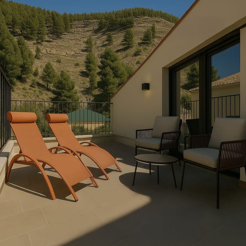 Despierta con el canto de los pájaros y relájate al sol en tu terraza privada. Equipada con tumbonas y zona de estar, es el lugar ideal para disfrutar de un café al amanecer o una copa al atardecer, rodeado del paisaje único de Alcalá del Júcar.