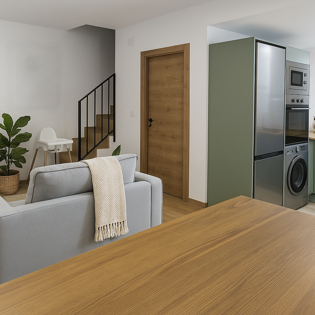 En la planta baja encontrarás un amplio salón-comedor con chimenea y televisión, conectado a una cocina americana totalmente equipada: lavadora, lavavajillas, horno, microondas, placa de inducción, cafetera Dolce Gusto, tostadora, batidora, vajilla completa y más. Además, cuenta con un aseo común para mayor comodidad.